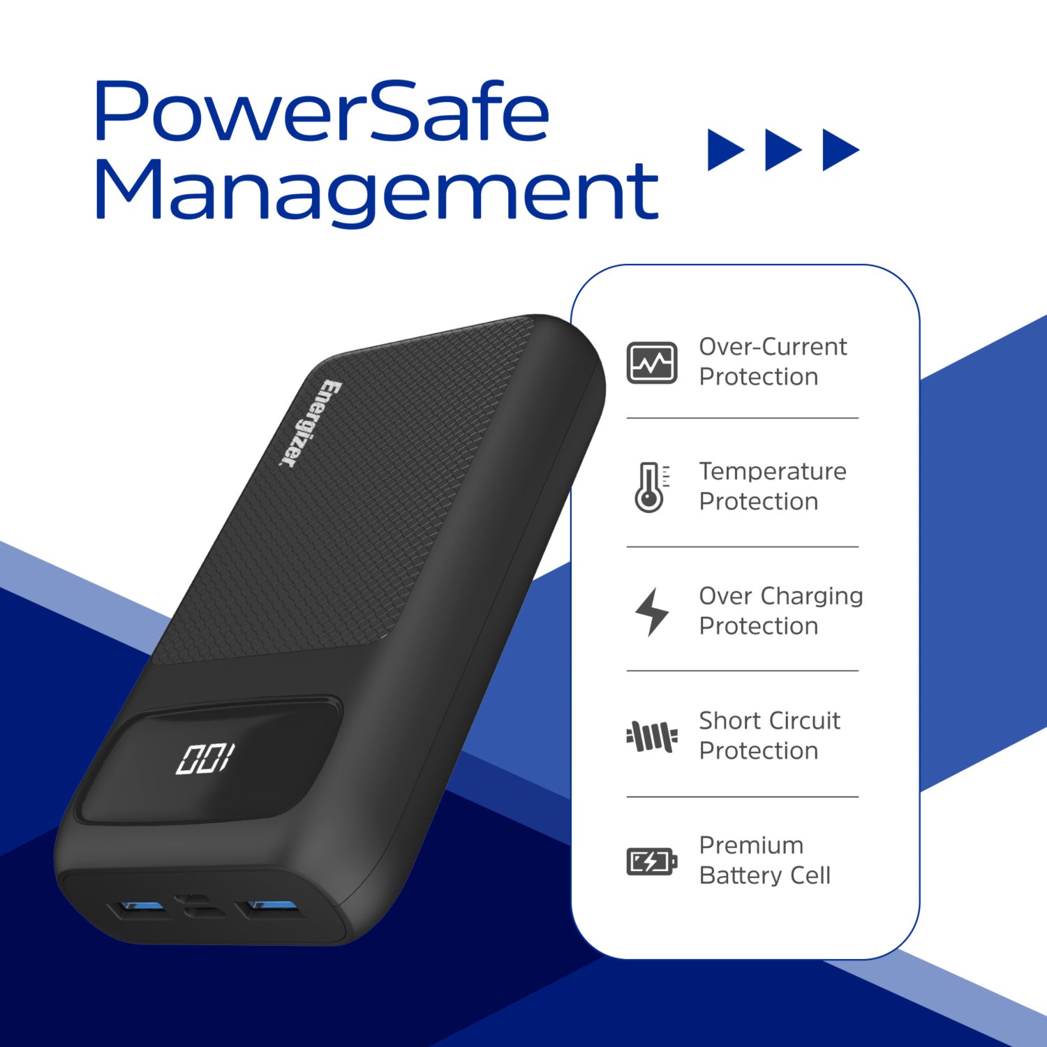 - ăPowerSafe ManagementăPowerSafe Management guarantees against short circuit, overcurrent, overcharge, and overdischarge for your power bank and devices.